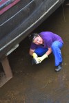 For the second time in two weeks we are back in the dry dock, except it is not very dry. The boat is dry (when it finally ceases to rain) but the dock does not drain completely. While it is only about an inch of yucky, smelly water, my baggy overalls sit in the water and gradually suck the wet up to my knees – all very jolly!