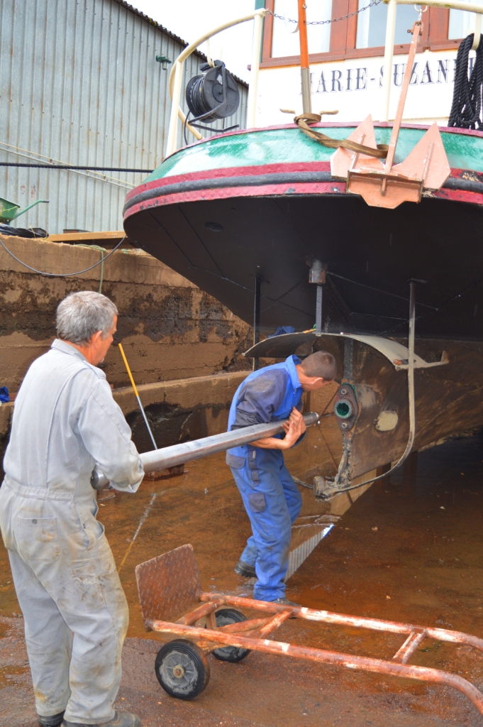 Hi Mike, good questions! There is a bolt in the middle of the nut that screws into the middle of the centre-line of the shaft. Noel says he couldn’t ascertain whether the threads run counter to each other! Yes, all SS. All going well here (despite the electrics taking a holiday! (shorepower) – we have the prop shaft in and prop secured, we have rudder on with new bearings, new seacock (for additional new loo at some point) and new hoses on old loo!, we were thinking we haven’t done much, then realised we only came out on Tuesday! All this work was wrapped around a hundred other things – well, you know what it is like on the hard!