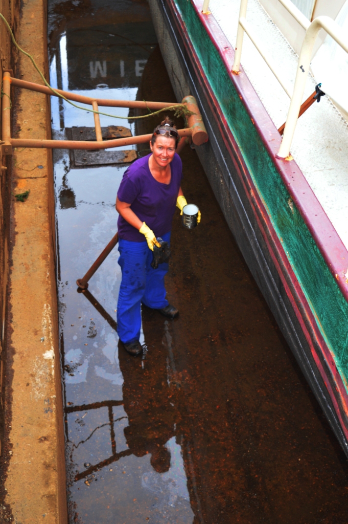 So, after preparing the surface (of the wheelhouse roof – see our ‘rain-catcher’ blog for more details), I had sore knees (I’m not twenty any more, oh okay, I’m not thirty any more either . . . !), I was covered in a fine coating of ‘dust’ and have earned my stiff muscles.