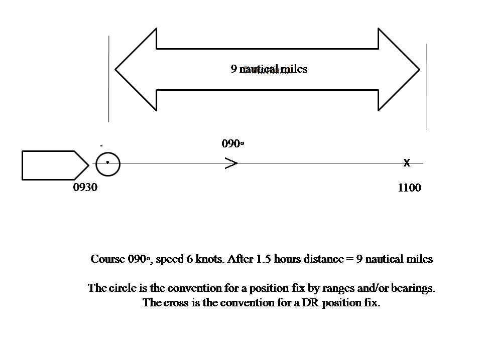 In one hour at 6 knots you would travel six miles, in another half an hour you would travel another three miles, therefore over an hour and a half you would have travelled a total of nine nautical miles. (The DR position is marked with an X and the time noted.)Remember, this example does not allow for set and drift. Estimated Position (EP) is DR with estimated set and drift applied.
