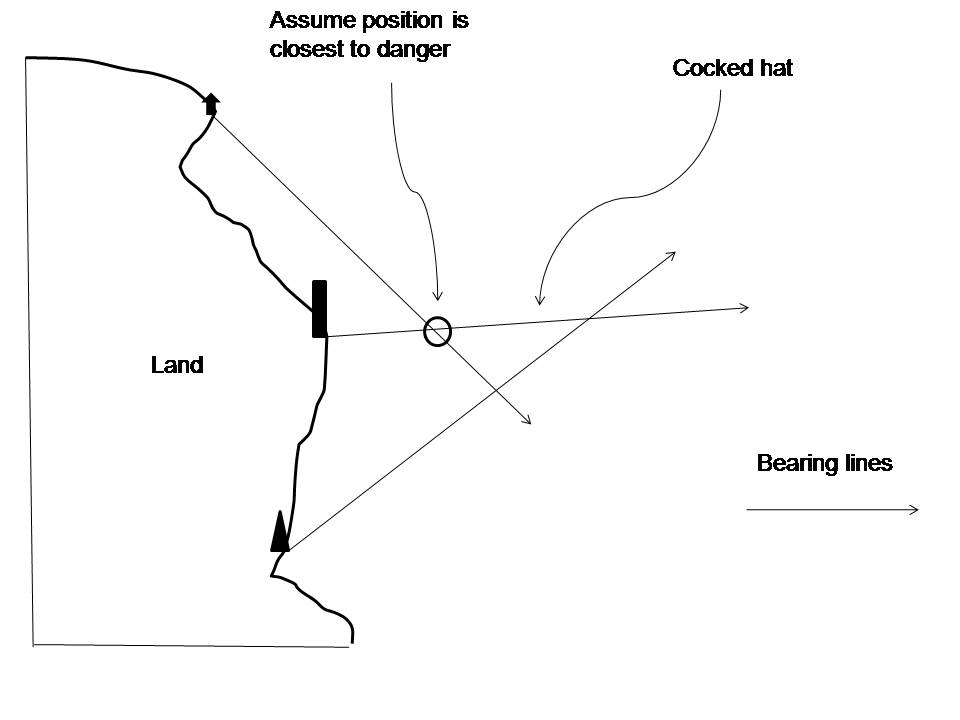 With three bearings, you may end up with a cocked hat where the three bearing lines meet (usually looks like a witch’s hat, see picture below). If it is not too big, mark your position in the cocked hat at the closest point to danger and have another go (in the example below, that position would be nearest to land). Cocked hats occur with errors (plotting, wrong identification of object, compass error incorrectly applied or unknown compass error), or this could occur with the imprecise reading of the compass or an unsteady hand when at sea.