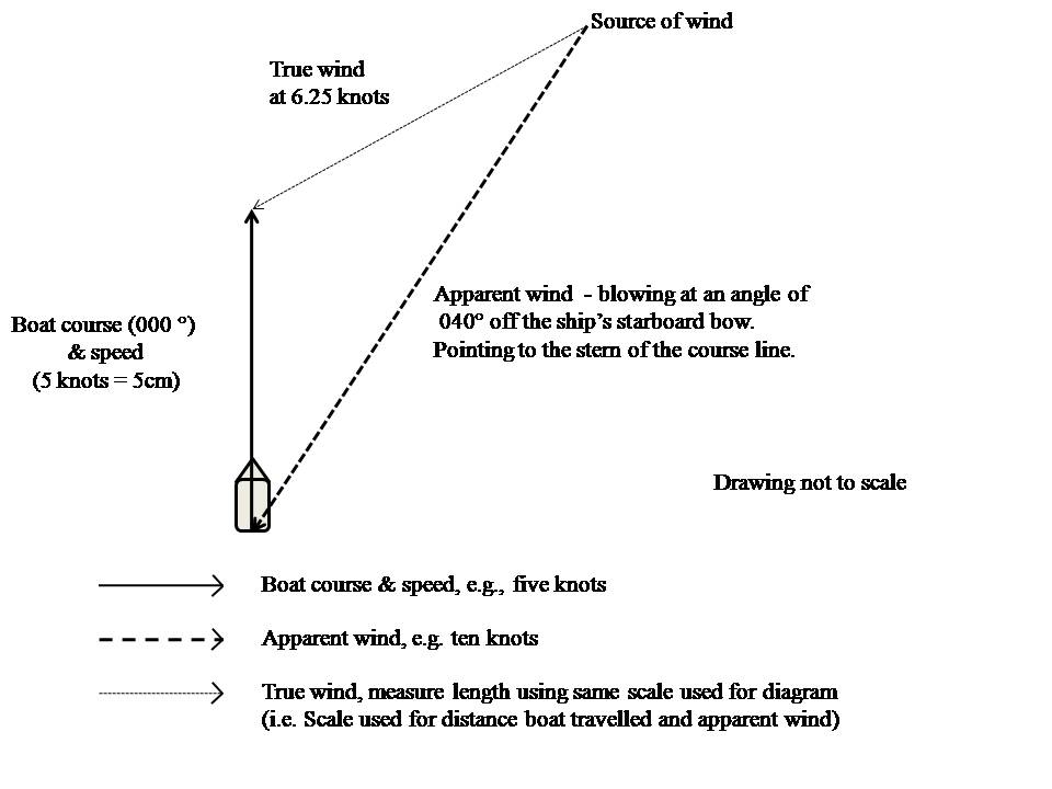- The True wind is the resultant vector drawn from the tail of the apparent wind line to the head of your vessel’s course and speed line.