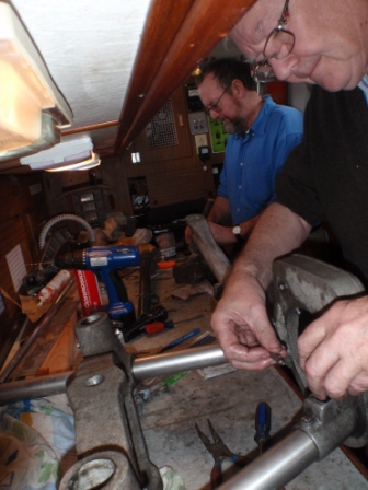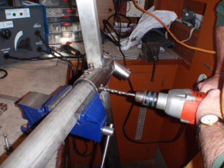 jparies 9 – The human drill press. Noel drilling through the new tiller head, into the new rudder stock extension. The bolts in place on top of the tiller head tighten against the inner sleeve to clamp firmly onto the rudder stock. (Noel recommends a drill-press).