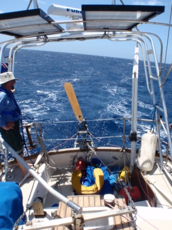 We find it imperative to have reliable self steering, ideally electrical and wind vane. We are ecstatic that the vane steers in such light winds. Our Wagner electric steering copes with calm seas, it is thirsty so it usually means we have the engine on.
