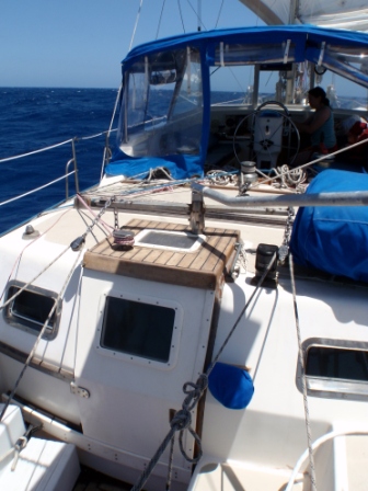 jparies 32 – On top of the hatch, the top of the remote spindle (left) and the windvane tiller and the emergency tiller. The aft cockpit entrance door, at sea, can be slid open or closed but the hatch stays firmly shut.