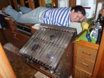 Throughout this morning, Noel has been merrily working on adapting our emergency steering to connect up the Aries. Between our jobs Noel and I call on each other to “hold that” “what do you think about this?” and “how about that?” type discussions. Noel’s job was particularly complex; there are stairs, hydraulic bypasses, hatches and life rafts to think about above and beyond the fixtures and fittings of the equipment itself. Today I came up with the idea of removing the pins from the hinges of the hatch to lift it over the emergency tiller arm, which simplified Noel’s original idea. Noel had already helped me prior to this by saying it was better to make something to stop stuff falling down the hole next the mast in the first place, rather than catch them, which was my initial idea.
