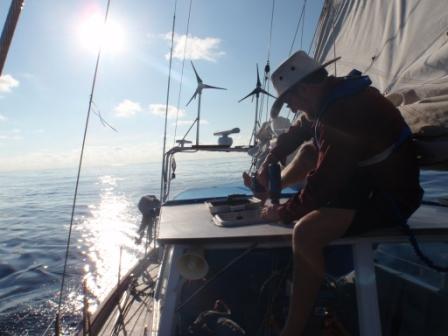 As we approached Cocos the weather calmed and Noel could install two hatches into our dodger – he has his harness on and no doubt his buttons are clenched!