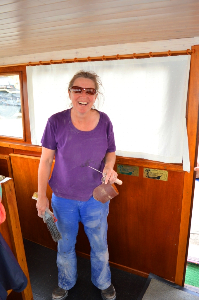 After we’d traversed the buying process, in order to get going Noel spent two-and-a-half days bent over like a crone in the engine room, he fixed umpteen leaks in the wheelhouse windows and we painted a 18.5 metre boat (“why’d you buy something so big?”) – hanging up-side-down to reach the hull or balancing in the leaking dinghy.