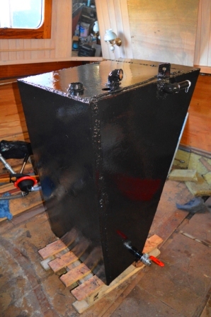 The new holding tank – made from one of water tanks. Sourcing the right welder was a rather frustrating project. Having to cut the big tank up INSIDE the boat, made the boat filthy. It was too big to get out, so Noel cut it into four pieces, two were the holding tank (including lid), the other two pieces were superfluous. The plumbing parts were purchased on-line and all in French. Other bits-and-pieces from the Brico-marche, eight kilometres away, hauling all purchases by bike.